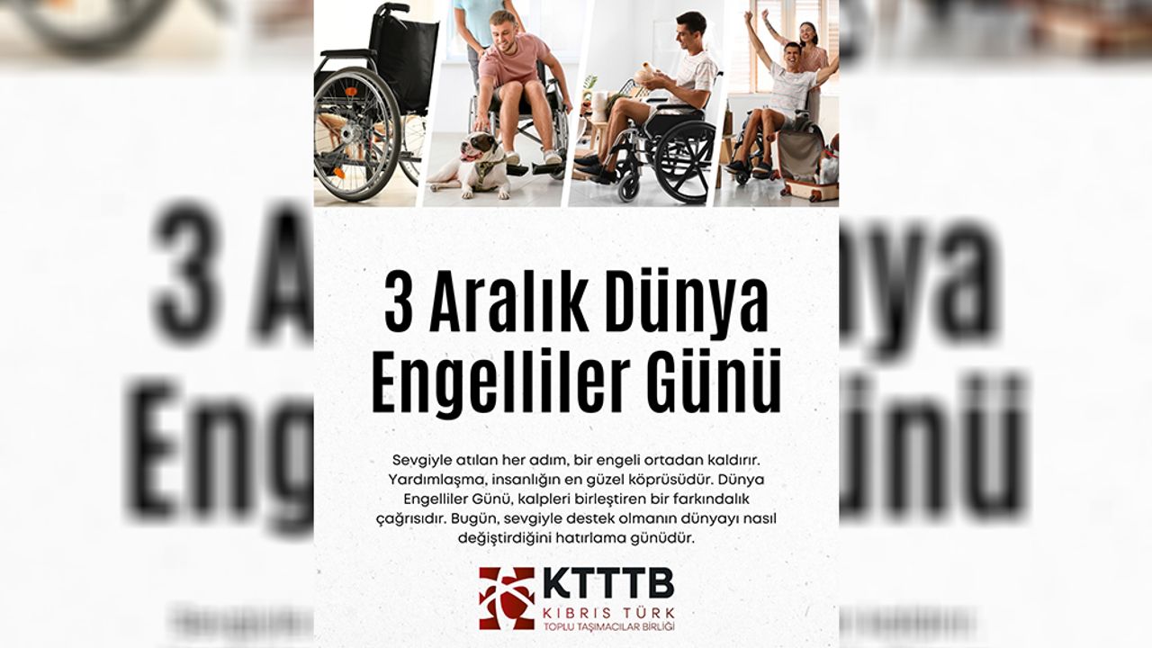 Kıbrıs Türk Toplu Taşımacılar Birliği (KTTTB), “Toplumun ayrılmaz bir parçası olan engelli bireylerin, sosyal yaşamda karşılaştıkları engelleri ortadan kaldırmak hepimizin ortak sorumluluğudur” dedi.