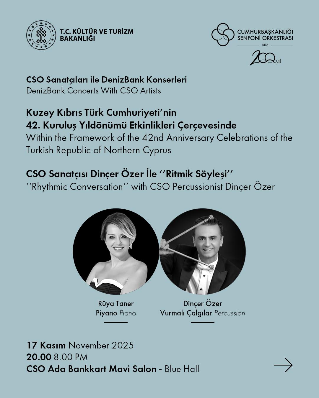 Kuzey Kıbrıs Türk Cumhuriyeti’nin 42. kuruluş yıldönümü etkinlikleri kapsamında, Cumhurbaşkanlığı Senfoni Orkestrası (CSO) sanatçısı Dinçer Özer ile piyanist Rüya Taner, CSO Ada Ankara – Bankkart Mavi Salon’da konser verecek.