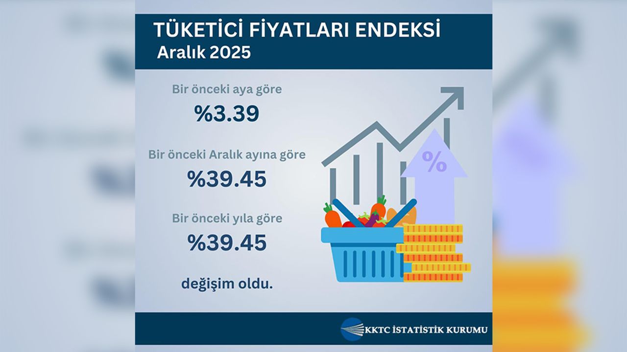 KKTC İstatistik Kurumu’nun Tüketici Fiyatları Genel Endeksi’nde, bir önceki aya göre yüzde 3,39, bir önceki yılın aralık ayına göre yüzde 39,45 ve bir önceki yılın aynı ayına göre yüzde 39,45 değişim yaşandı.