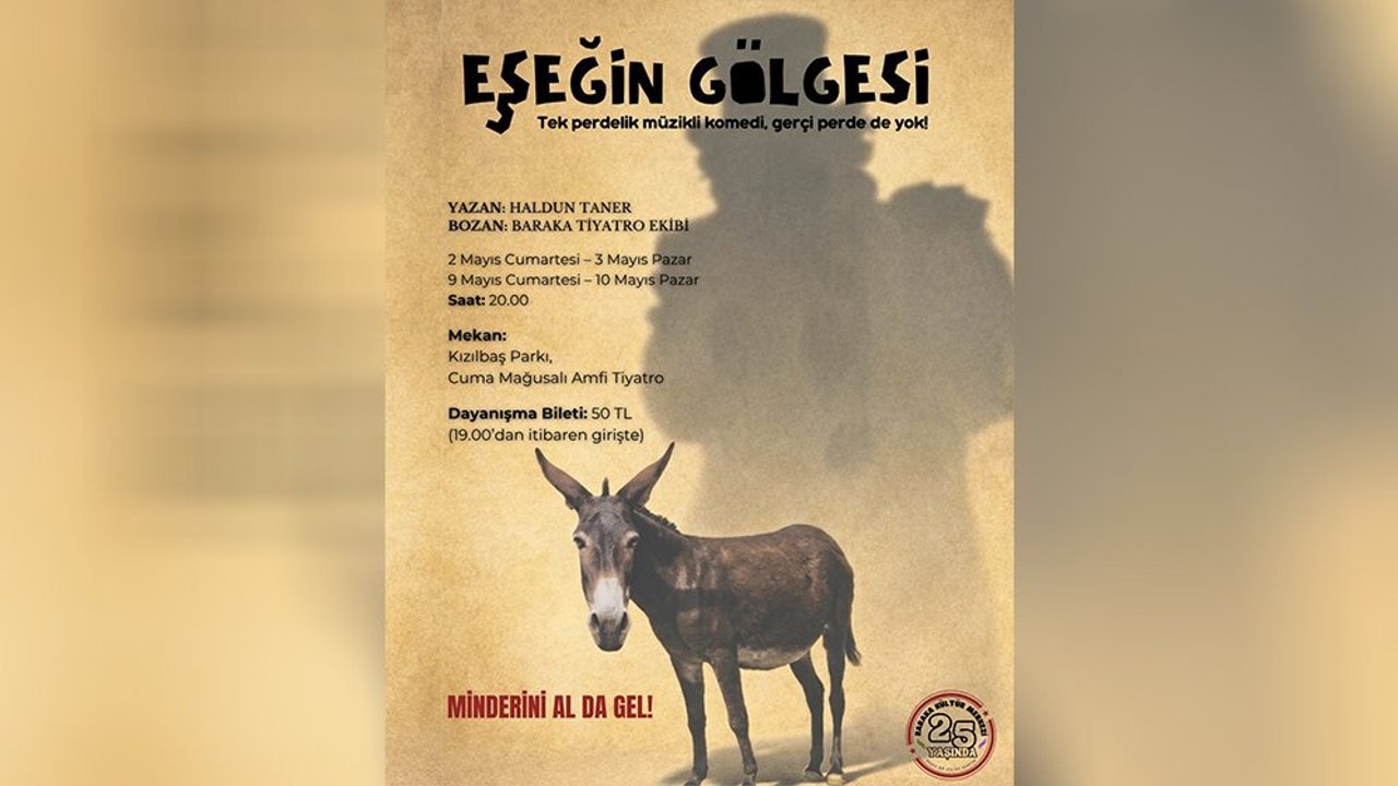 Haldun Taner’in yazdığı, Baraka Tiyatro Ekibi’nin uyarladığı “Eşeğin Gölgesi” oyunu, ilk kez 2 Mayıs Cumartesi saat 20.00’de Kızılbaş Parkı Cuma Mağusalı Amfi Tiyatro’da sahnelenecek.