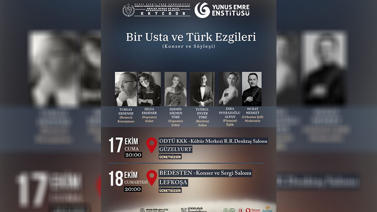 Devlet Opera ve Bale Koordinasyon Merkezi ile Lefkoşa Yunus Emre Enstitüsü iş birliğinde düzenlenen “Bir Usta ve Türk Ezgileri” konseri cuma günü Güzelyurt ODTÜ KKK’de, cumartesi günü ise Lefkoşa Bedesten’de sanatseverlerle buluşacak.
