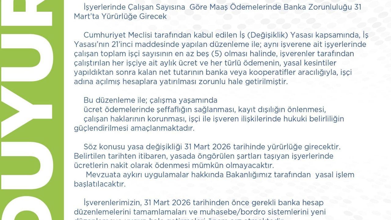 Bakanlık açıklamasında, işverenlerin 31 Mart’tan önce gerekli banka hesap düzenlemelerini tamamlaması ve muhasebe/bordro sistemlerini yeni düzenlemeye uygun hale getirmesinin önem taşıdığı vurgulandı.