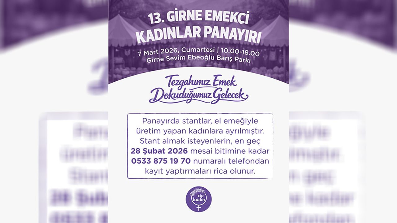 Program detaylarının önümüzdeki günlerde açıklanacağı etkinlikte stant açmak, etkinlik sergilemek, toplumla buluşmak ve mesaj iletmek isteyen kadınlar ile sivil toplum örgütlerinin, en geç 28 Şubat Cumartesi’ne kadar 0533 875 1970 numaralı telefondan CTP Kadın Örgütü Girne İlçesi’ne ön kayıt yaptırması gerekiyor.