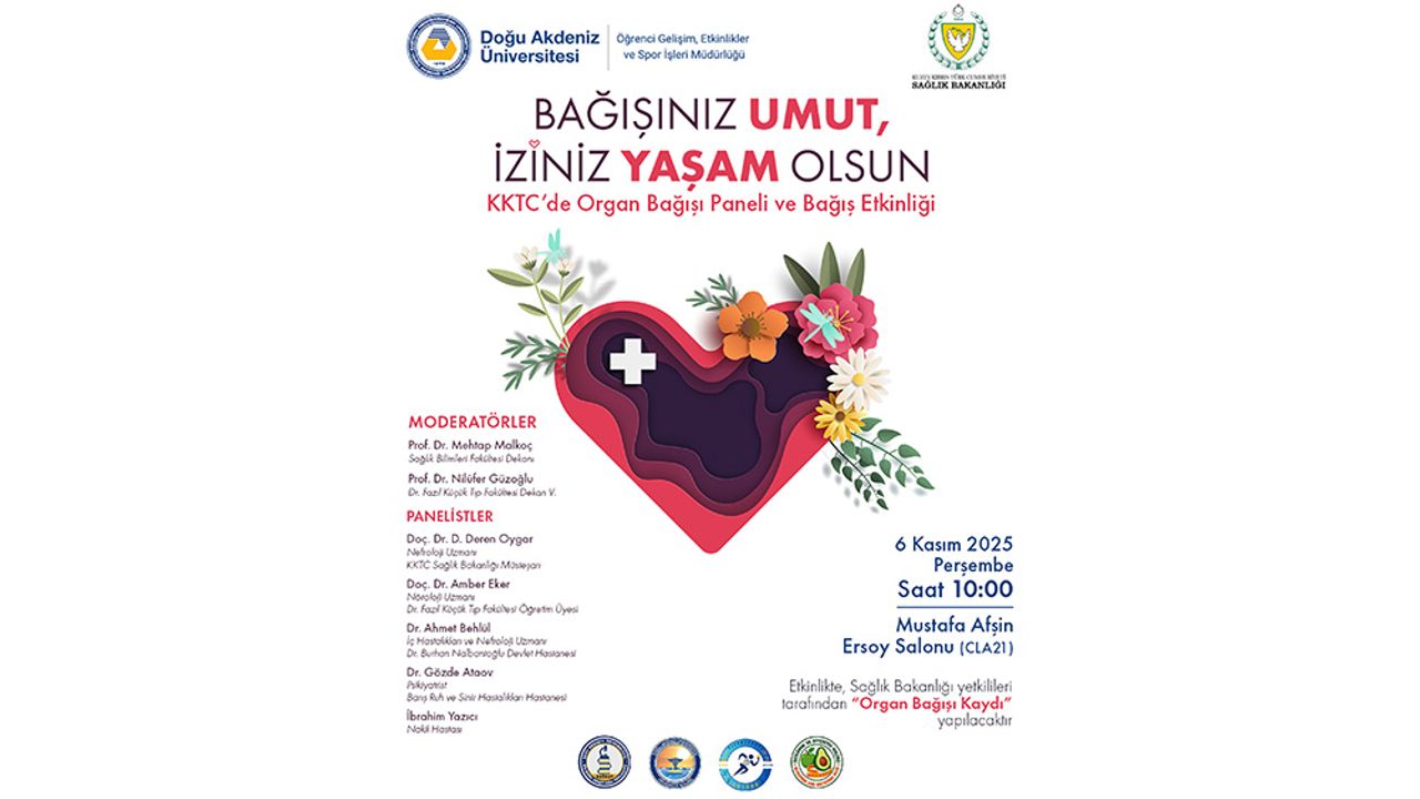 KKTC’deki organ bağışında güncel durum, İnsan Hücre, Doku ve Organ Nakli Yasası, beyin ölümü, organ bağışının psikolojik yönleri, organ bağışında küresel sorunlar ve çözüm önerileri ile hasta ve hasta yakınlarının deneyimlerinin ele alınacağı panelin ardından KKTC Sağlık Bakanlığı yetkilileri tarafından “Bağış Etkinliği” gerçekleştirilecek.