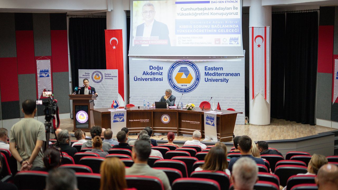 Cumhuriyetçi Türk Partisi (CTP) Genel Başkanı ve cumhurbaşkanı adayı Tufan Erhürman, Doğu Akdeniz Üniversitesi Akademik Personel Sendikası (DAÜ-SEN) tarafından düzenlenen “Cumhurbaşkanı Adayları ile Yükseköğretimi Konuşuyoruz” etkinliğinde akademisyenler ve öğrencilerle bir araya geldi.
