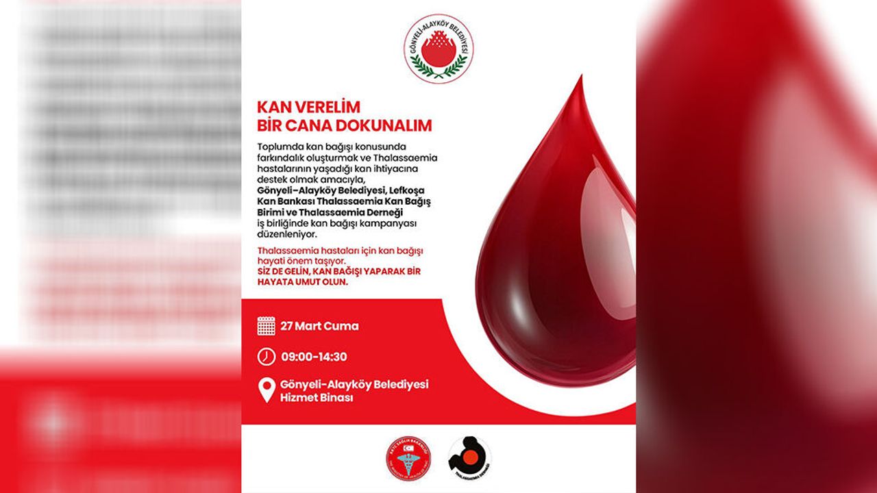 Gönyeli–Alayköy Belediyesi, Lefkoşa Dr. Burhan Nalbantoğlu Devlet Hastanesi Kan Bankası Thalassaemia Kan Bağış Birimi ve Thalassaemia Derneği iş birliğinde kan bağışı kampanyası düzenleyeceğini açıkladı.