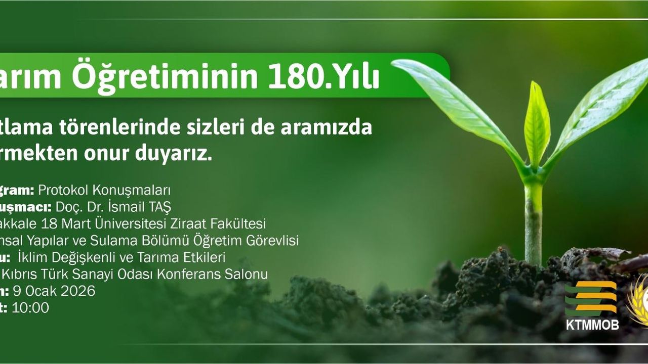 Tarım öğretiminin başlamasının 180’inci yıl dönümü kapsamında Kıbrıs Türk Mühendis ve Mimar Odaları Birliği’ne (KTMMOB) bağlı Ziraat Mühendisleri Odası tarafından düzenlenecek seminerde, 18 Mart Çanakkale Üniversitesi Ziraat Fakültesi Tarımsal Yapılar ve Sulama Bölümü öğretim görevlisi Doç. Dr. İsmail Taş sunum yapacak.