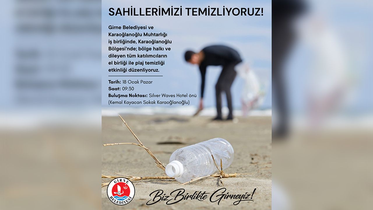 Girne Belediyesi ve Karaoğlanoğlu Muhtarlığı iş birliğinde, çevre duyarlılığını artırmak ve sahilleri temiz tutmak amacıyla Pazar günü plaj temizliği etkinliği düzenleniyor.
