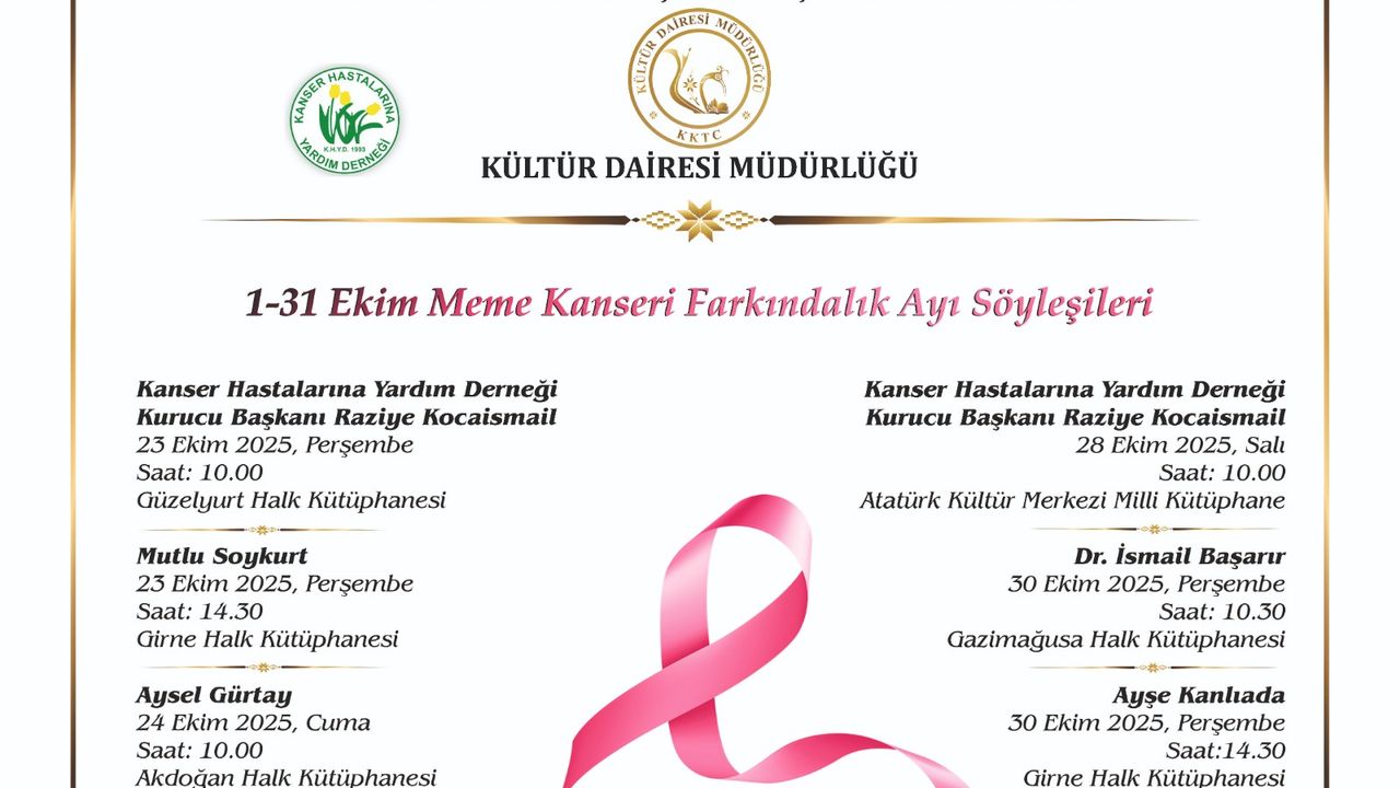 Kültür Dairesi’nin 1-31 Ekim Meme Kanseri Farkındalık Ayı için düzenlediği söyleşiler 28 Ekim Salı günü Lefkoşa’da Atatürk Kültür Merkezi Milli Kütüphane’de gerçekleştirilecek. Kanser Hastalarına Yardım Derneği Kurucu Başkanı Raziye Kocaismail’in Güzelyurt Halk Kütüphanesi’ndeki söyleşinin ardından ikinci kez konuk olacağı söyleşi programı saat 10.00’da Atatürk Kültür Merkezi Milli Kütüphane’de başlayacak.