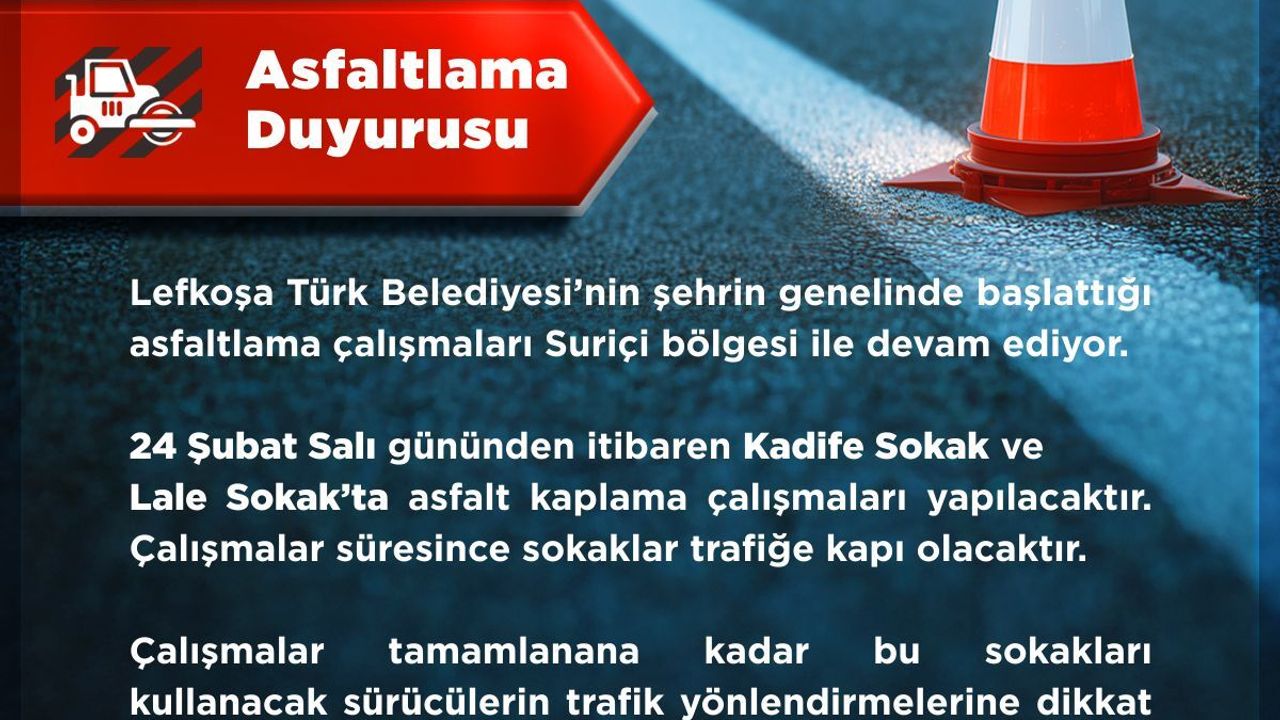 LTB’den yapılan açıklamaya göre, yarından itibaren Kadife Sokak ve Lale Sokak’ta asfalt kaplama çalışmaları yapılacak ve çalışmalar süresince sokaklar trafiğe kapı olacak.