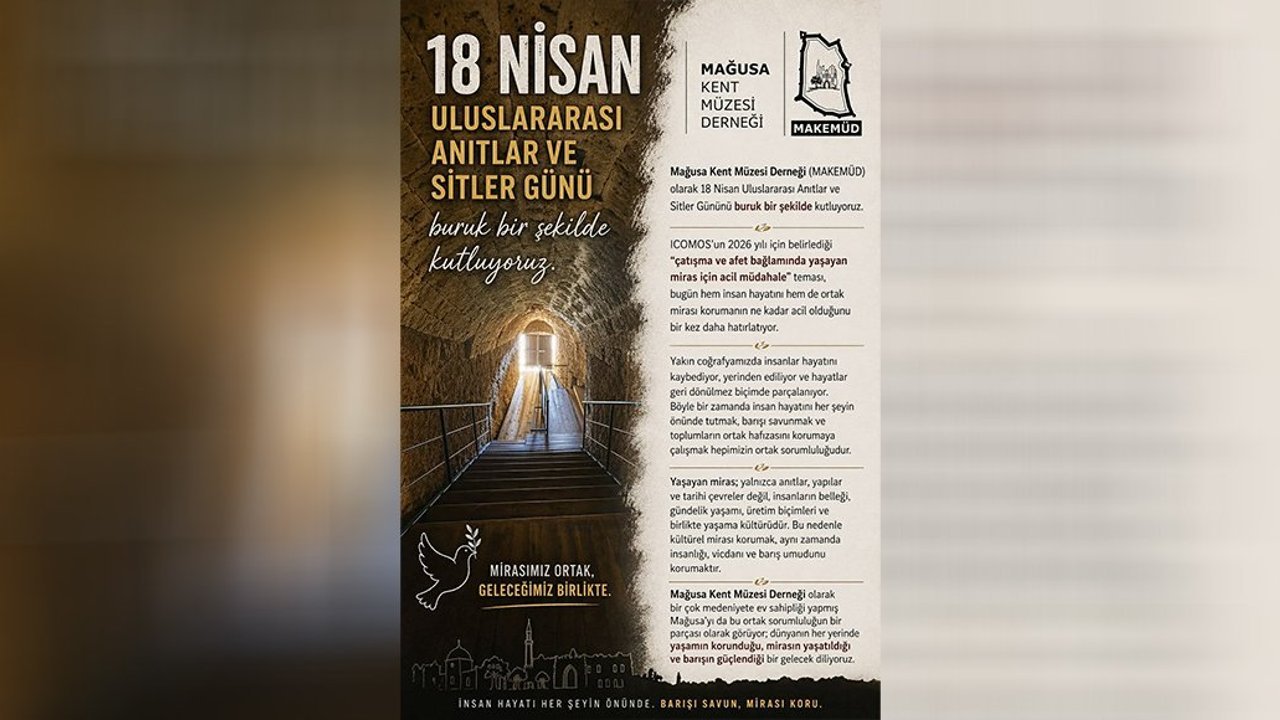 MAKEMÜD 18 Nisan Uluslararası Anıtlar ve Sitler Günü sebebiyle bir mesaj yayımlanarak, Uluslararası Anıtlar ve Sitler Konseyi'nin (ICOMOS) 2026 yılı için “Çatışma ve afet bağlamında yaşayan miras için acil müdahale” teması belirlediğini kaydetti.