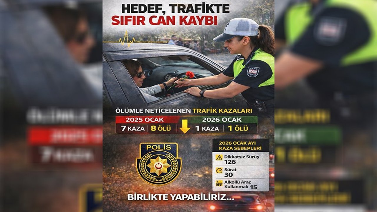 “Trafik Kurallarına Uyarak Sen De Güvenli Trafiğe Katkı Yap” ve “Birlikte Yapabiliriz” sloganıyla PGM’den yapılan açıklamada, trafikte güvenlik seviyesini artırmak amacıyla Polis Genel Müdürlüğü tarafından hayata geçirilen “toplum destekli polislik uygulamaları ve farkındalık çalışmaları” sonucunda, 2026 yılının Ocak ayında meydana gelen ölümlü trafik kaza sayısı ile yaşanan can kayıplarında, önceki yıla kıyasla belirgin bir düşüş sağlandığının görüldüğü kaydedildi.