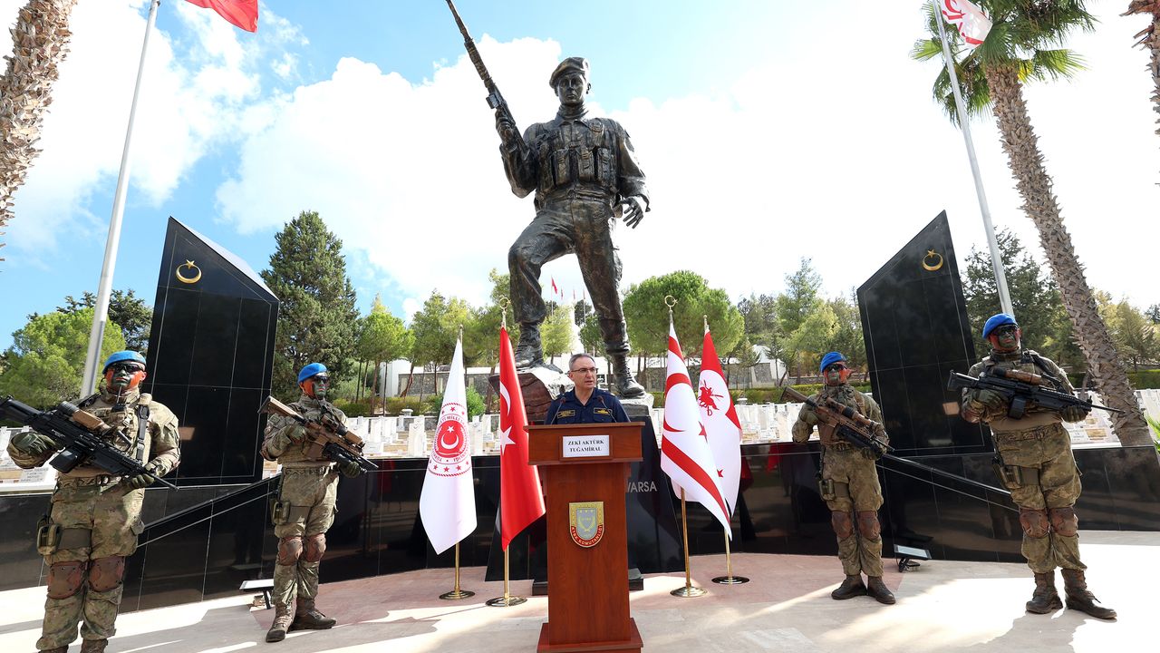 MSB Basın ve Halkla İlişkiler Müşaviri ve Bakanlık Sözcüsü Tuğamiral Zeki Aktürk, 20 Temmuz 1974'te gerçekleştirilen Kıbrıs Barış Harekatı'nda vatan ve millet uğruna şehit olan kahraman Mehmetçiğin ve mücahitlerin yan yana yattığı Girne Boğazköy Şehitliği'nde düzenlenen haftalık basın bilgilendirme toplantısında konuştu.