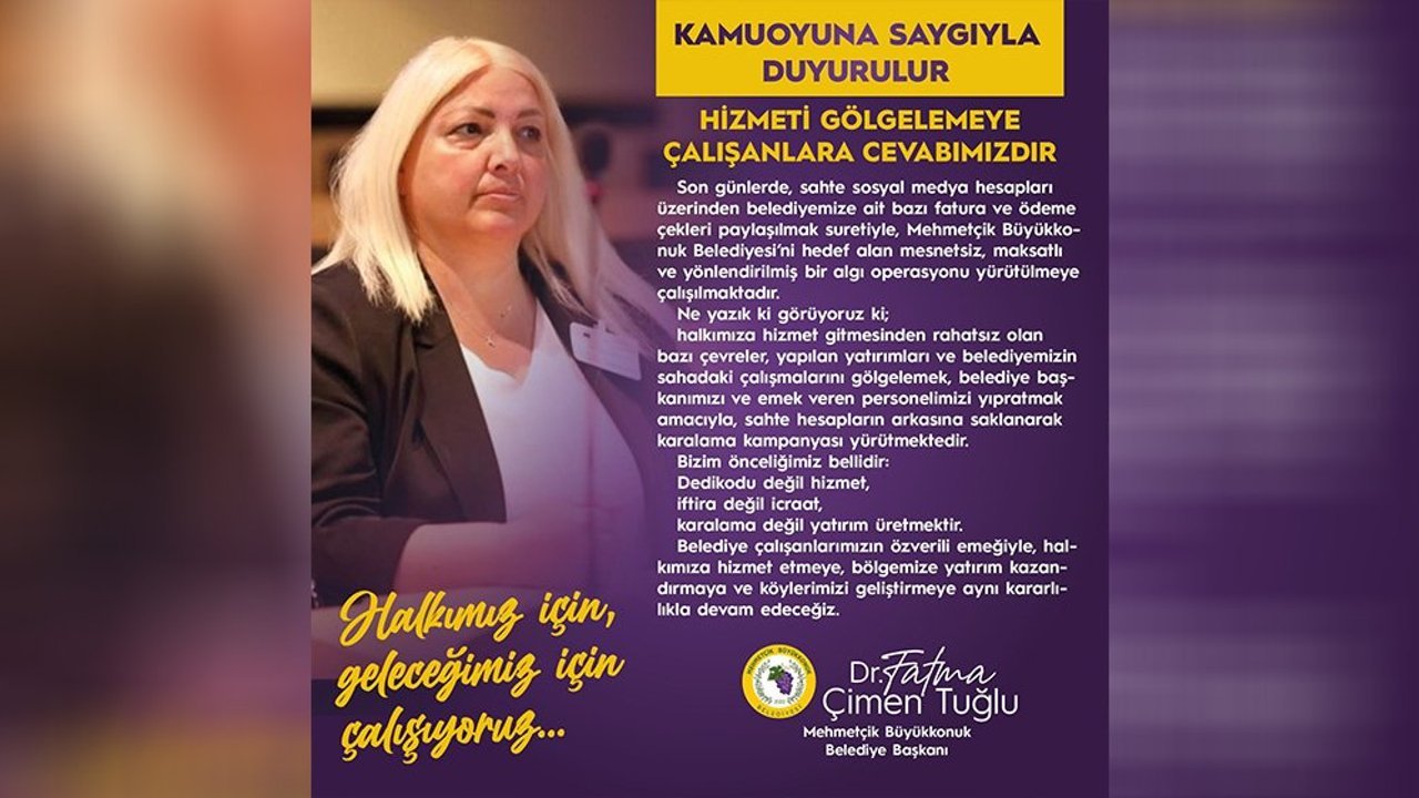 Mehmetçik Büyükkonuk Belediyesi Başkanı Dr. Fatma Çimen Tuğlu, son günlerde sosyal medyada gündeme gelen iddialara ilişkin yazılı bir açıklama yaptı. Belediye, sahte hesaplar üzerinden yürütüldüğü belirtilen paylaşımların “mesnetsiz ve maksatlı bir algı operasyonu” olduğunu vurguladı.