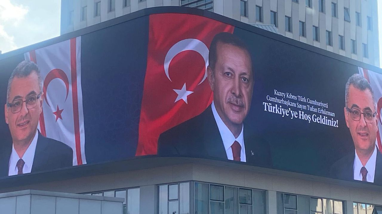 İletişim Başkanlığı’nın Ankara’daki binasındaki ekranda Türkiye Cumhuriyeti Cumhurbaşkanı Recep Tayyip Erdoğan ve Cumhurbaşkanı Tufan Erhürman’ın fotoğrafları “Kuzey Kıbrıs Türk Cumhuriyeti Cumhurbaşkanı Sayın Tufan Erhürman, Türkiye’ye Hoşgeldiniz” ifadeleriyle yer aldı.