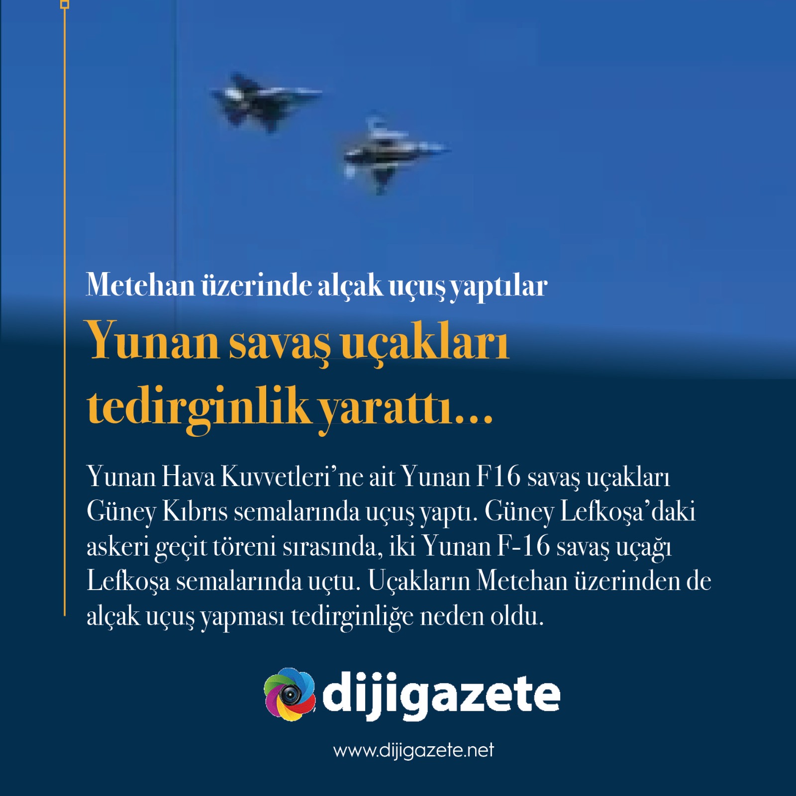 Yunan Hava Kuvvetleri'ne ait Yunan F16 savaş uçakları Güney Kıbrıs semalarında uçuş yaptı. Güney Lefkoşa'daki askeri geçit töreni sırasında, iki Yunan F-16 savaş uçağı Lefkoşa semalarında uçtu. Uçakların Metehan üzerinden de alçak uçuş yapması tedirginliğe neden oldu.